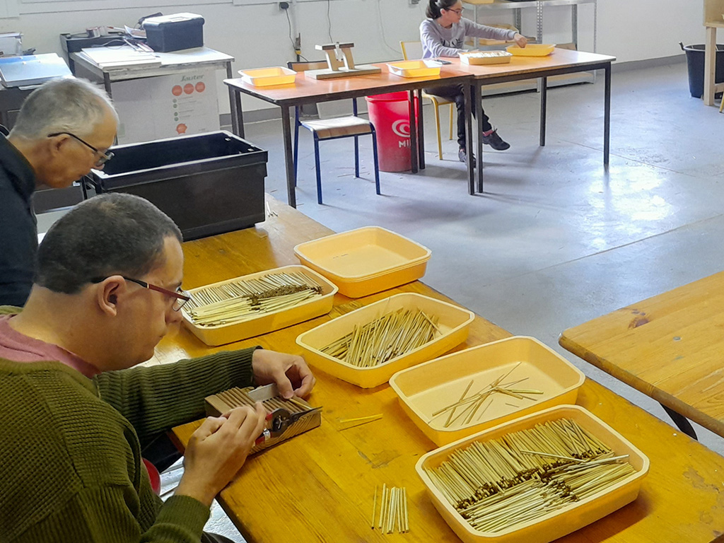 Un atelier où la sollicitation physique est moins importante que sur les autres ateliers. L’objectif est de créer des pailles pour boire à partir de la tige de seigle bio.